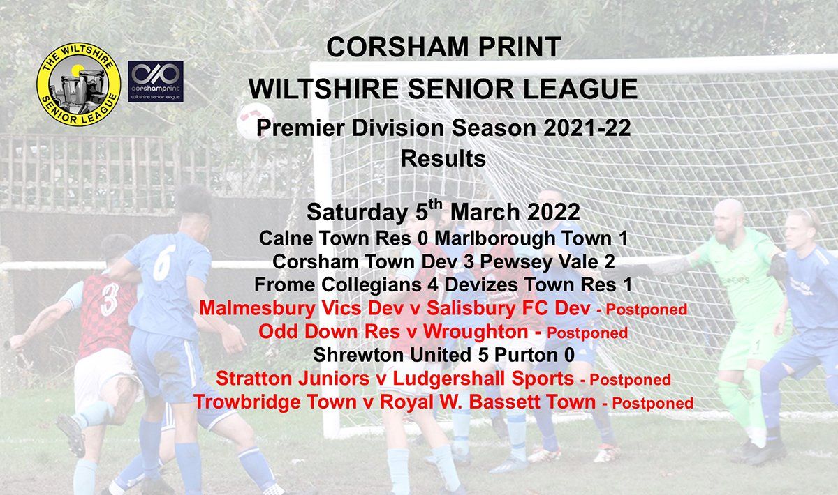 A combination of waterlogged pitches and a couple of teams being unable to raise sides this weekend meant only half of the scheduled eight fixtures in the Premier Division of the Corsham Print Wiltshire Senior League went ahead. The weeke nd had been scheduled to see all the top four in action against each other, however, the match between second place Royal Wootton Bassett Town and Trowbridge Town was one of the games postponed, the wet weather and unauthorised use of the pitch at Woodmarsh resulting in the game having to be postponed. This postponement gave Pewsey Vale