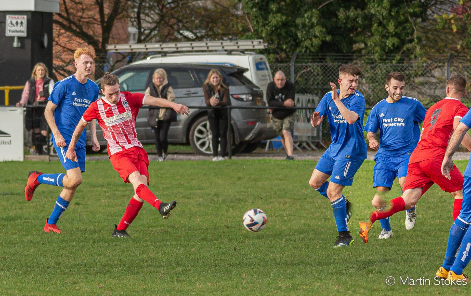 Harvey Swain scoring Devizes Town Reserves ' opening goal against Purton (picture courtesy of Martin Stokes)