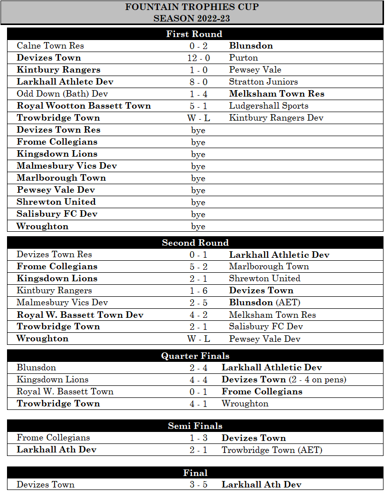 Larkhall would also go on to win the Fountain Trophies Cup, defeating four Premier Division sides on their way to lifting the cup, including the top two sides Trowbridge Town and Devizes Town. The latter win over Devizes came in the final where an impressive showing from Larkhall saw them win 5-3 in an entertaining game.