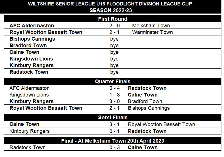 Congratulations to Kintbury on their title success in their first season at the Under 18 level, losing just that one game all season. Congratulations also to Royal Wootton Bassett Town on securing runners-up for the second consecutive season and well done also to Calne Town and Radstock Town for their excellent seasons, with just a single point in the end separating the runners-up from the two sides who finished in joint third position. Calne Town and Radstock Town also had the consolation of that cup final appearance with Calne winning the final 3-0 to lift the trophy. They had been beaten finalists in the inaugural Under 18 Cup competition, but this time were convincing winners on the night.