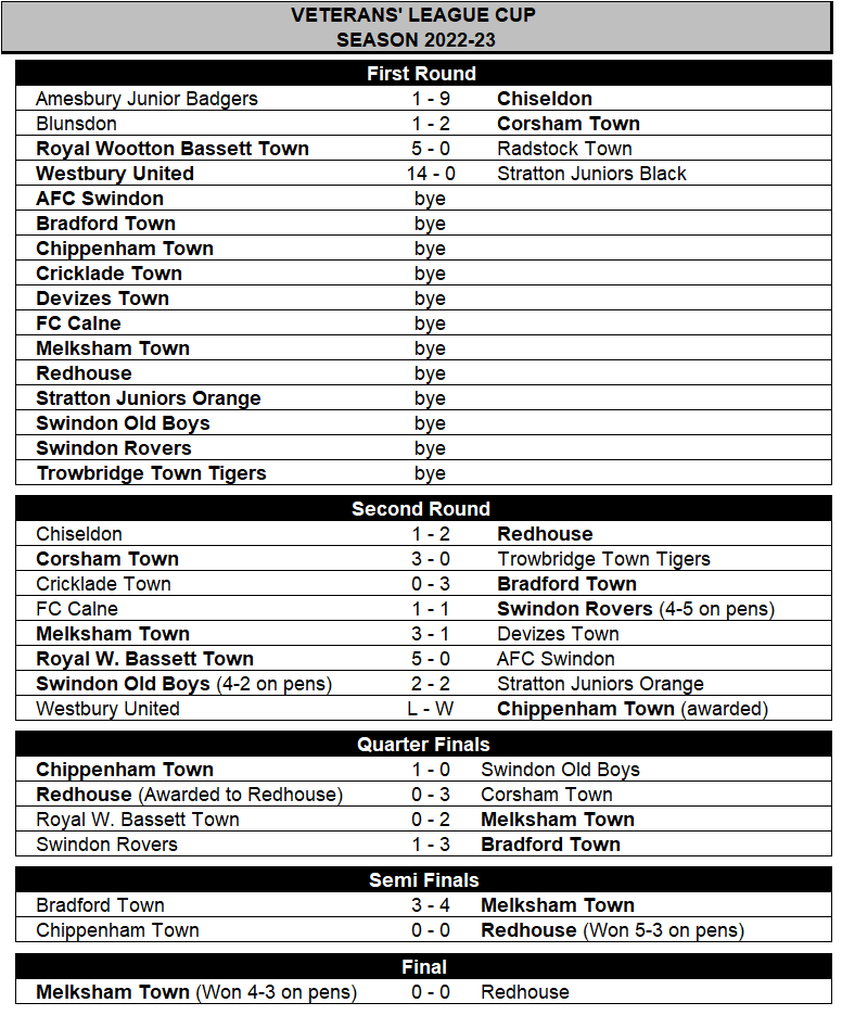 The title race itself saw both of the two previous champions, Corsham Town and Melksham Town, once again involved with Bradford Town, Westbury United and Devizes Town the other sides who were fighting for honours, although the latter two fell away at the end to leave a three-team battle for honours which went right to the end of the season. Last season’s champions Melksham Town led the way from the start of the season and would go unbeaten in all competitions until May the 1st. By that time they had already secured a cup double having won the Wiltshire County FA’s Veterans’ Cup, where they had defeated Royal Wootton Bassett Town from the North Wiltshire Division 4-0 in the final and also then won the League’s Veterans’ Cup having beaten another North Wiltshire Division side, Redhouse in the final after a penalty shoot-out. With Redhouse scoring all three of their opening penalties and Melksham failing to register with their opening two, few would have predicted the final outcome. Melksham scored with their third with Redhouse then missing their fourth and fifth penalties meaning the shootout went to sudden death. With Redhouse failing to score with their sixth penalty and with Melksham scoring theirs it was Melksham who triumphed in the end 4-3 in a remarkable penalty shootout turnaround. Of the five missed penalties, four of them were actual saves by the two keepers, who were both the stars of the final.