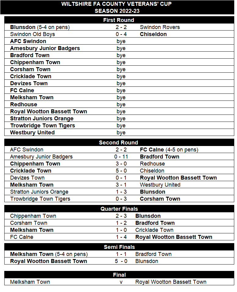 The semi-final match up drawn by the Wiltshire FA had guaranteed that the final would see a representative from each of the two Veterans’ divisions, with the two remaining Mid Wiltshire Division sides, Melksham Town and Bradford Town, up against each other and the two remaining North Wiltshire Division sides, Blunsdon and Royal Wootton Bassett Town in the other semi-final.