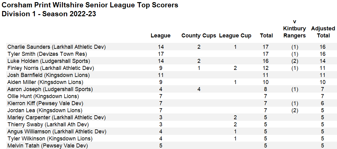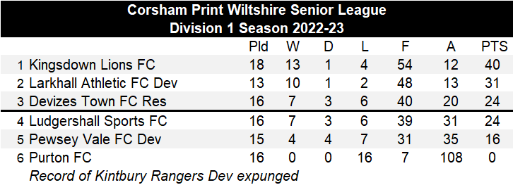The other game in Division One saw the two teams battling it out for the third promotion spot up against each other. Ludgershall Sports and Devizes Town Reserves started the day level on points, separated only by goal difference with both sides having five games to go. After ninety minutes this afternoon it is as you were at the start of the day as the two sides fought out a 2-2 draw with both teams’ leading scorers both scoring twice for their respective sides. Tyler Smith took his adjusted total for the season to 16, joining Larkhall’s Charlie Saunders at the top of the Division 1 goalscoring chart. Ludgershall’s Luke Holden also bagged a brace and is two goals behind the two leader scorers. Devizes and Ludgershall have to meet one more time this season and of the remaining three games for each side, Devizes have much the tougher run in with Larkhall Athletic Development to play twice, whilst Ludgershall Sports have two games against bottom of the table Purton still to come.