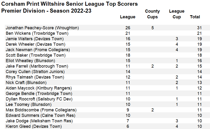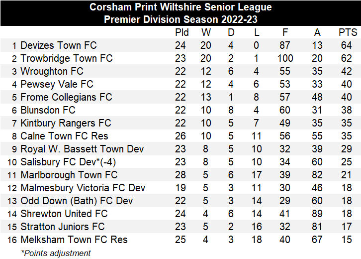 After spending many weeks at number two in the Premier Division table, Devizes Town finally took over at the top on what had been officially designated Non-League Day. With Trowbridge Town scheduled to be in Fountain Trophies Cup action, although in the end their game was postponed, Devizes had the chance to finally dislodge them from that top spot and they didn’t disappoint their supporters. They were up against near neighbours Calne Town Reserves. With many connections between the two sides, including the Devizes management and many of their players having been at Calne last season, it meant there was added extra spice to the game. Calne have been in decent form of late and a close game was anticipated, as had been the case in the game between the sides earlier in the season. That day Devizes had edged it by a solitary goal, but they had a much more comfortable afternoon in the return. Two more goals from Jamie Walters, who moved onto 19 for the season, plus two also for Matthew Russell, with Rhys Talmash adding a fifth, saw Devizes secure a 5-0 win that saw them move two points clear at the top having played one game more than Trowbridge. Next week sees Devizes themselves in cup action with a semi final against Frome Collegians, giving Trowbridge the opportunity to regain top spot when they travel to Kintbury Rangers in the league.
