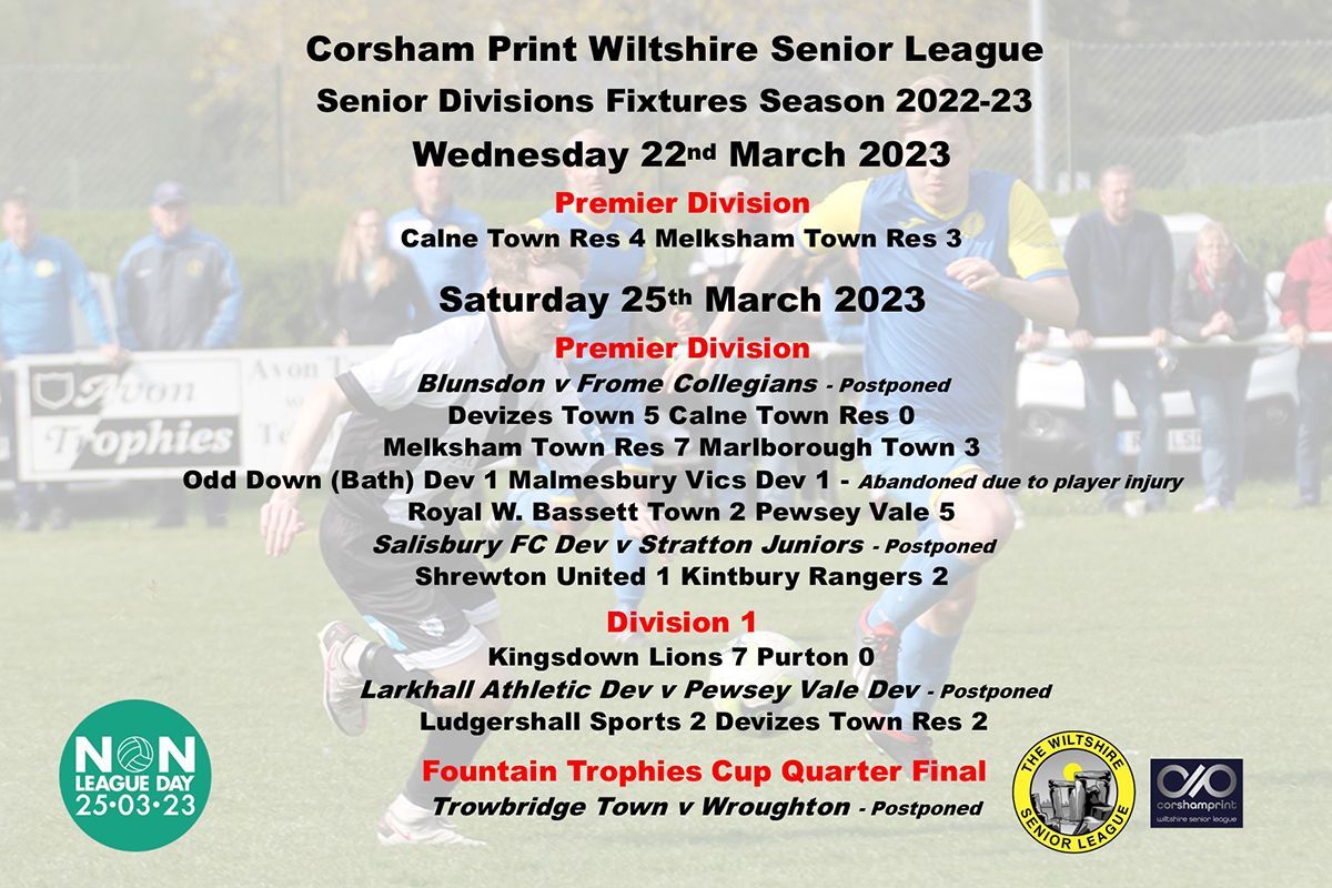 The league games between Blunsdon and Frome Collegians, Salisbury FC Dev and Stratton Juniors, and Trowbridge Town against Wroughton in the Fountain Trophies Cup, were all postponed due to waterlogged pitches.