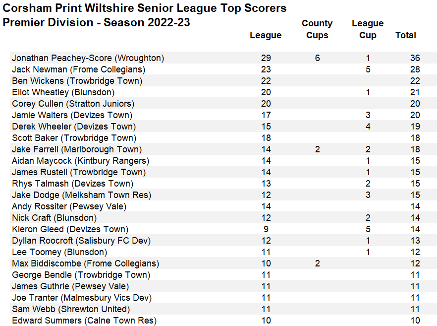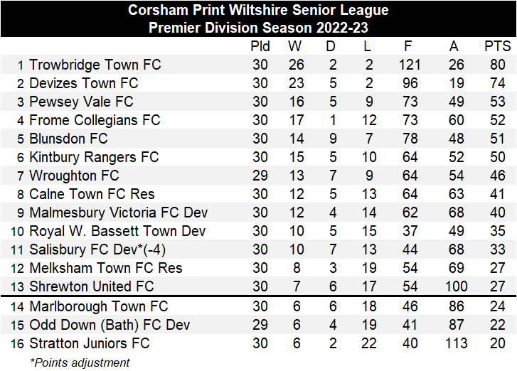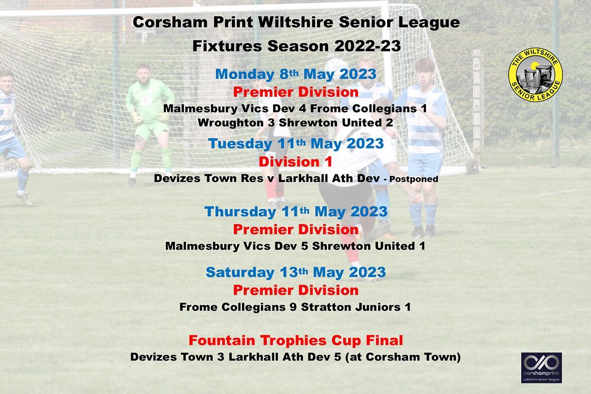 Two other sides, Malmesbury Victoria Development and Shrewton United had finished their fixtures in midweek both playing on Monday and then playing each other on Thursday night. On Bank Holiday Monday Malmesbury had ended Frome Collegians aspirations of finishing in third spot in the table. It was all square at half time, Kyle Witt having put Malmesbury ahead but Jack Newman having brought Frome back level. However, three unanswered Malmesbury goals after the break saw them secure the three points, two more goals for Joe Tranter who moved onto eleven for the season, with the score being rounded off by a goal from Reuban Badman three minutes from time.