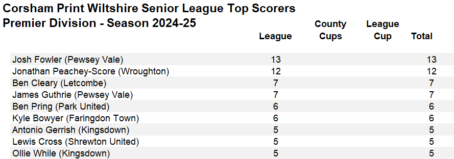 There was a limited schedule of midweek games in the Premier Division of the Corsham Print Wiltshire Senior League but once again the fixtures provided more evidence that, with one or two exceptions there is very little between the teams this season, with just about everybody capable of beating everyone else.