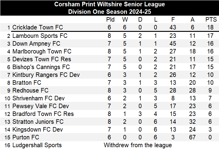 Near neighbours Bishops Cannings remained on their coat tails picking up a fifth win in seven games following a 5-3 home victory over Kingsdown Development. Szymon Raczek was the star of the show for Bishops Cannings smashing his second hat-trick of the season, Oliver Barnes and Caleb Hollow with the other two Bishops Cannings goals. Bishops Cannings are level on points with Devizes with both teams having played seven games. Reece Ricks, Callum Miller and a third of the season from Liam Geraghty in reply for Kingsdown Dev.