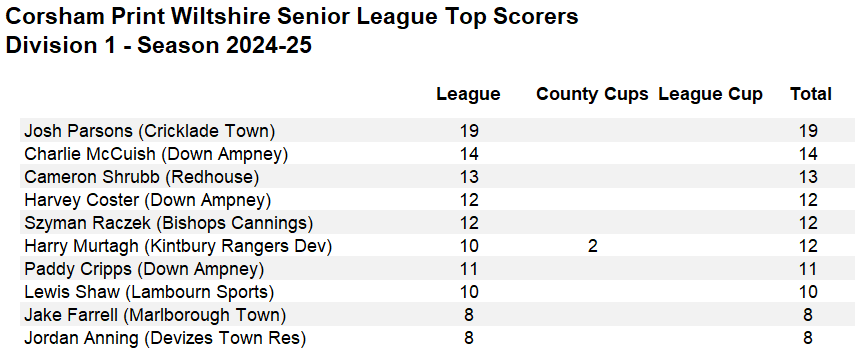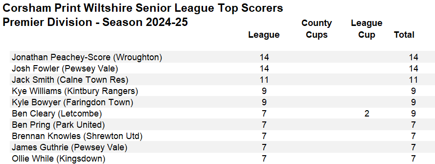 Another goal for Josh Fowler in Pewsey's 5-1 win over Malmesbury kept him top of the goal scoring chart in the Premier Division.