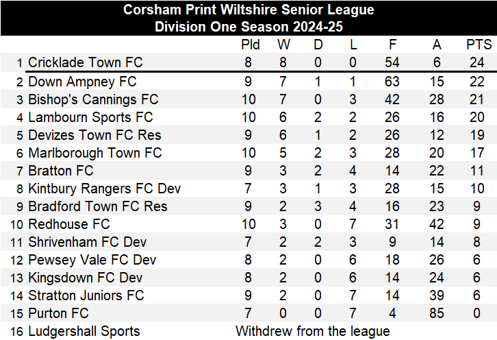 Calne Town Reserves are the in-form team in the division, and they extended their unbeaten run to six games, five of which have been won, with a comprehensive 5-0 victory over near neighbours Royal Wootton Bassett Town Development. There was a hat-trick for Jack Smith who took his tally for the season to eleven, Harry Stiles and Edward Summers with their first goals of the campaign with the other two Calne goals. The latest victory saw Calne climb a place in the table to sixth spot.