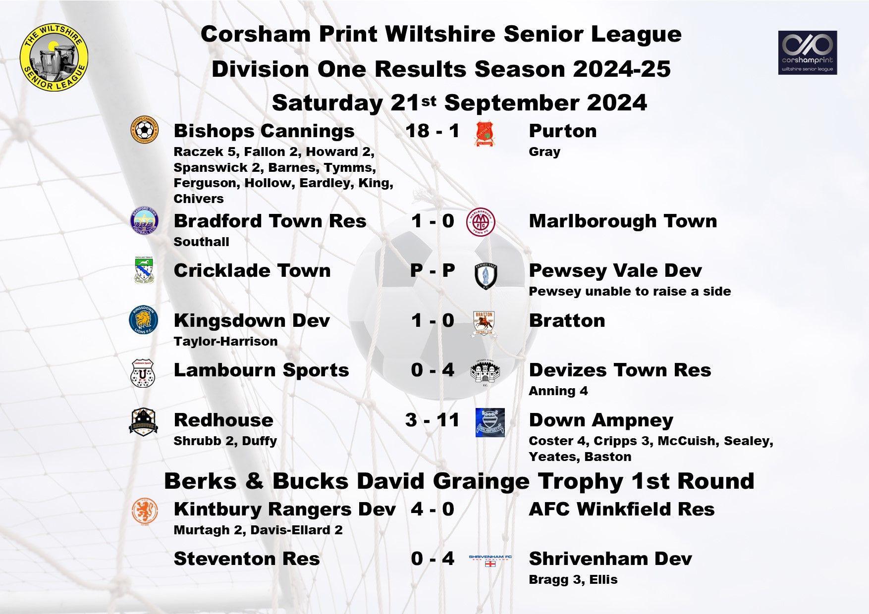 It was a successful afternoon for sides from the Corsham Print Wiltshire Senior League in the Berks & Bucks David Grainge Trophy, as both Kintbury Rangers Development and Shrivenham Development progressed to the Second Round courtesy of 4-0 wins. Kintbury Rangers Development found themselves 3-0 up at half time in their game against AFC Winkfield Reserves from the Thames Valley League Division 2 thanks to two goals from Alfie David-Elland and one from Harry Murtagh. A second for Murtagh after the break made sure of Kintbury’s progress into Round 2.