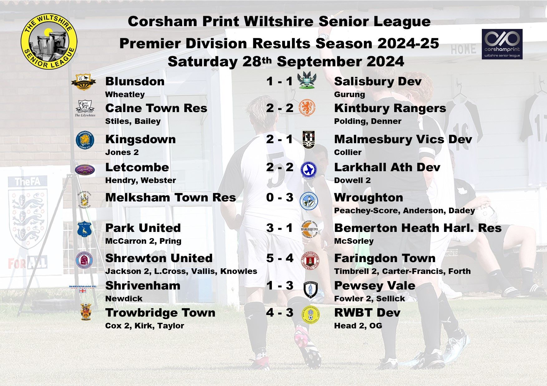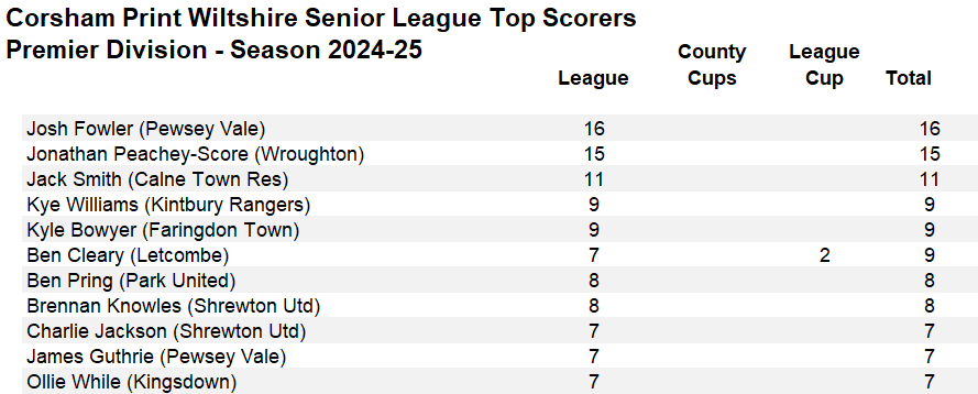 The Premier Division's two leading scorers were once again amongst the goals, Josh Fowler scoring twice for Pewsey in their 3-1 win at Shrivenham and Jonathan Peachey-Score scoring one one the goals in Wroughton's 3-0 win at Melksham