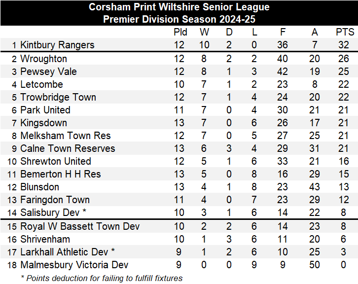 Shrivenham. Trailing 1-0 at the break to a goal from Shrivenham’s Jacob Newdick. Having twice hit the bar in the last ten minutes of the first half, Pewsey continued to push hard after the break to get back into the game and once they found a way through, they went on to score two more to run out 3-1 winners. Two more for leading scorer Josh Fowler who moved onto 16 for the season and sole ownership for now of the leadership position in the Premier Division scoring charts, Rory Sellick with the other Pewsey goal. Pewsey remain a point behind Wroughton and seven behind Kintbury with all of the top three having now played 12 games.