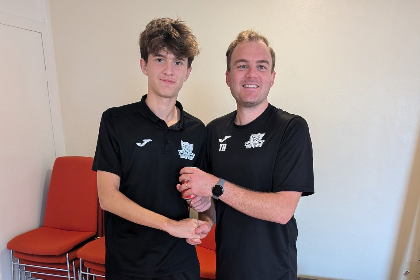 Harry Stiles who scored one of the two Calne Town Reserves goals against Kintbury Rangers picking up his man of the match award & Sean Bailey the scorer of the other Calne Town Reserves goal (pictures courtesy of Calne Town Res)