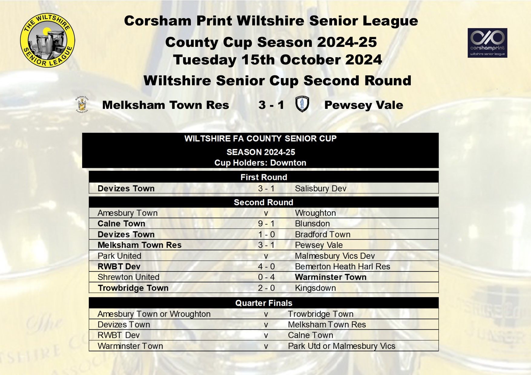 One of the three outstanding games in the Wiltshire Senior Cup was played on Tuesday night and it saw Melksham Town Reserves progress to the quarter final at the expense of fellow Wiltshire Senior League Premier Division side Pewsey Vale thanks to two goals from Luke Ballinger and one from Leo Rendell in a 3-1 win, Andy Rossiter with the Pewsey goal. It was not Pewsey's night as they had two players dismissed, ending the game with just nine men. Melksham Town Reserves will be away to near neighbours Devizes Town in the quarter final.