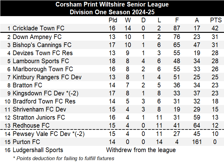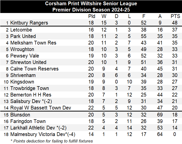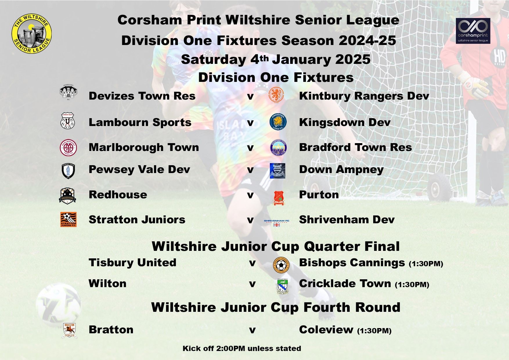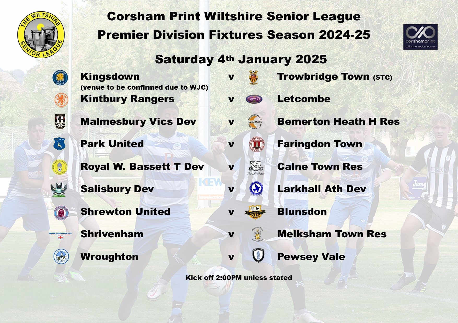 On a final note, all at the Corsham Print Wiltshire Senior League wish all our clubs, match officials, players registered with the league, sponsors, media partners and supporters a happy and prosperous New Year. All 33 clubs in the Premier Division and Division One are scheduled to be in action in either league or cup fixtures on the first Saturday in January.