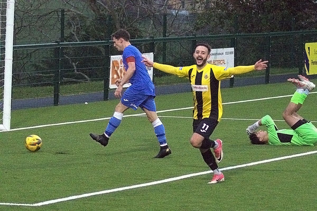 Jamie Jordan celebrates scoring Trowbridge's second goal against Larkhall Ath Development & Larkhall attacking the Trowbridge goal