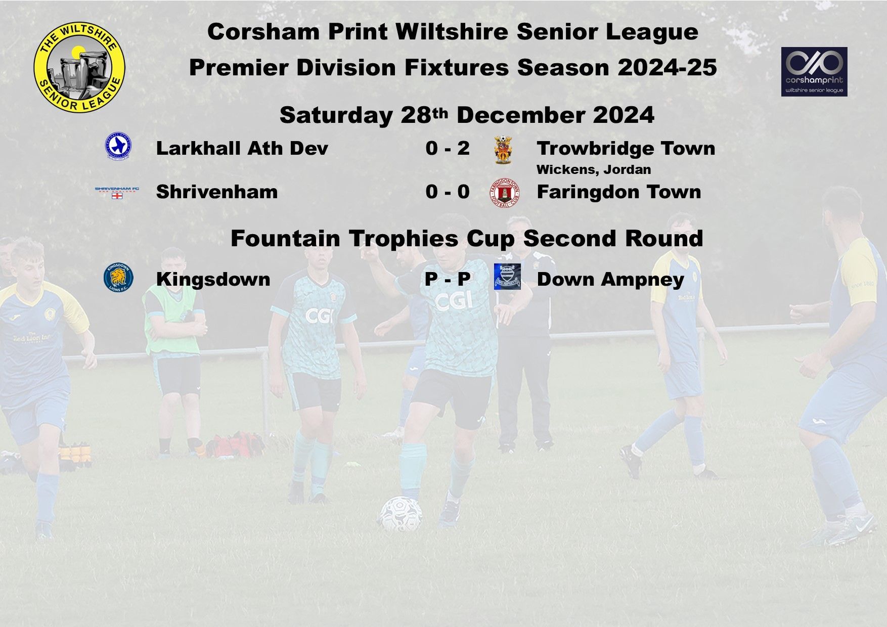 Normally there are no games in the Corsham Print Wiltshire Senior League between Christmas and New Year but in a break from tradition, with an 18 team Premier Division, a couple of league games and one Fountain Trophies Cup tie were scheduled for this Saturday. Unfortunately, on Saturday morning there was still standing water in the goalmouths at Southbrook Rec which meant the cup game between Kingsdown and Down Ampney was postponed. As this was the second attempt to stage this tie it will now switch to being a Down Ampney home game when it is rescheduled.
