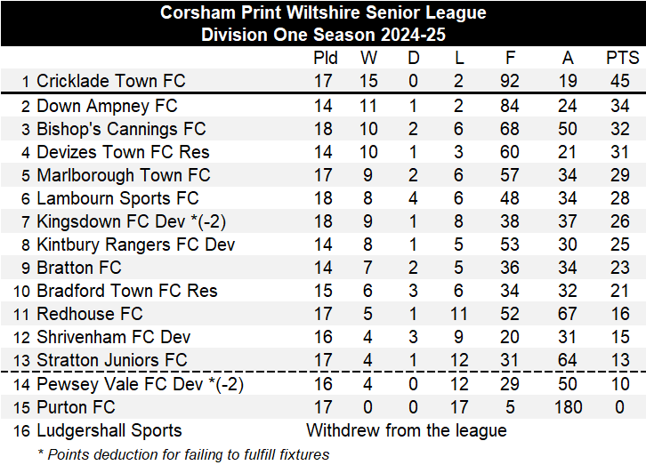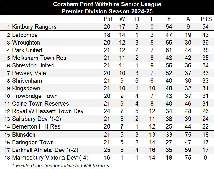 There were two big games impacting the bottom end of the table with Royal Wootton Bassett Town entertaining Faringdon Town at the Sustain Stadium and Salisbury up against Malmesbury Vics Development at Bulford. Royal Wootton Bassett Town started the day five points above the drop zone and six points ahead of scheduled opponents Faringdon Town, although Faringdon had played three games less. In an evenly matched game between two sides in terms of possession and chances, one side was to prove to be more efficient in front of goal to claim the three points and that was the home side Royal Wootton Bassett Town. They went in front with just seven minutes on the clock and there was an element of good fortune about the goal as what looked like a cross from the right from leading scorer Flynn Walters deceived Faringdon keeper Jack Gibson and ended up in the far top corner of the net for 1-0. Royal Wootton Bassett then doubled their lead when a ball over the top found Mani Mesas who beat his defender and then placed a shot past Gibson into the far bottom corner of the net for 2-0. The home side buoyed by the two goals went in search of a third and two minutes later Walters went close again, firing just over after neat interplay involving Mesas and Dale Richards. Both sides continued to enjoy plenty of possession but when the visitors did put the home side under pressure from balls into the box, they found home keeper Adam House in commanding form coming to claim and successfully take all of the crosses and corners and it remained 2-0 at the break. Seven minutes into the second half the home side went further in front after a corner into the box eluded keeper Gibson and his defenders and was headed in at the back post by Mesas for his second of the game. To their credit Faringdon continued to try and get themselves back into the game and, with the home side seemingly thinking the game was won, started to put the home side under sustained pressure. They went close to pulling one back 18 minutes from time when a free kick was acrobatically turned over by House. However, from the resulting corner Luke Davenport found the back of the net with House this time unable to prevent the ball going in as Faringdon pulled one back. Faringdon continued to pressurise the home goal and Matthew Bibby went close ten minutes from time with an effort from outside the box that went just over. Five minutes later skipper Raymond Lovell had a header that went just wide. Royal Wootton Bassett saw out the closing minutes to register a 3-1 win and three vital points to avoid the drop. Faringdon meanwhile remain in the drop zone and are still without a win away from home with just two points on their travels.
