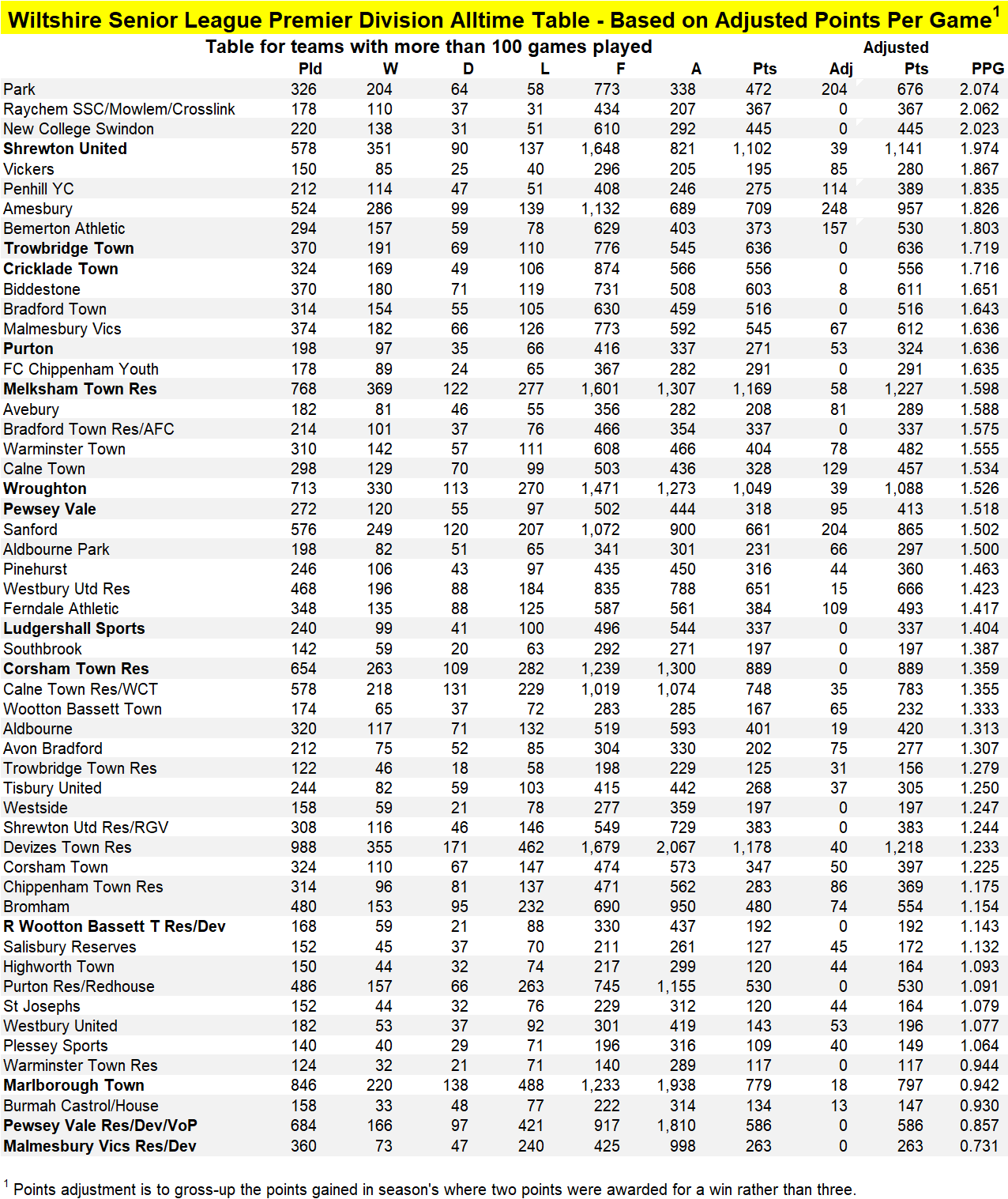 The final table below looks at the rankings based on total adjusted points over the 44-year existence of the league. In this final table four of the top six places feature current members of the league, with Melksham Town Reserves heading the table with Shrewton in third spot, Wroughton fourth and Corsham Town Reserves in sixth place.