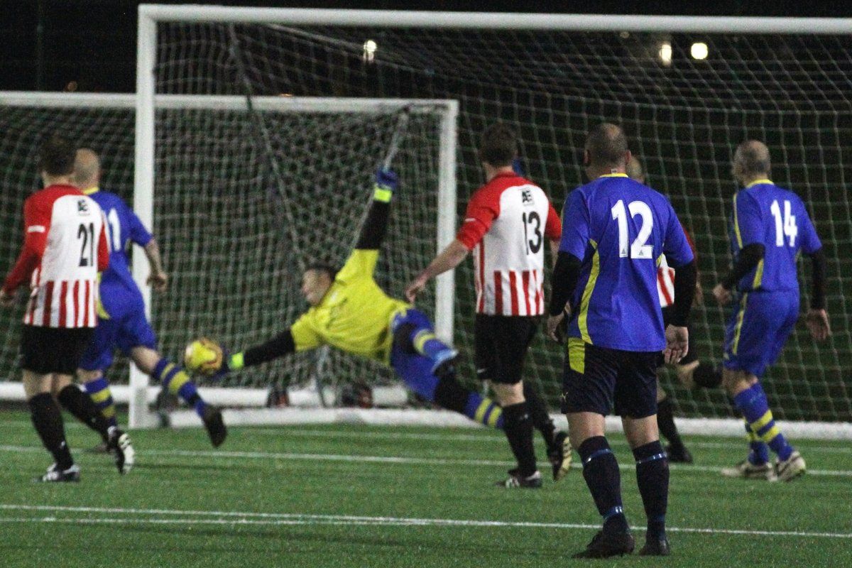 At the InfiLED Melksham Town, current leaders on goal difference in the Mid Wiltshire Division, entertained KMLC from the North Division whose only defeat of the season so far had come against Redhouse, a side Melksham had beaten in the last round of the Veterans’ County Cup. On Monday Melksham dominated possession for much of the first half but their normally prolific strike force were unable to take any of the chances that came their way. Melksham twice hit the woodwork and found KMLC keeper Jason Knight in top form, but it was not all one way as KMLC went close just after half time to breaking the deadlock, Paul Cooper with that chance. Melksham are the equal top scorers in the Mid Wiltshire Division, whilst KMLC have the highest goals per game ratio in the two Divisions but there was to be no goals in normal time in this tense semi-final meaning penalties were needed to decide who progressed to the final. Melksham scored all four of their spot kicks but KMLC hit the bar with one of theirs before Melksham’s Nick Evans pulled off a great save with their fourth to ensure it was Melksham who progressed to the final courtesy of a 4-2 penalty shoot-out win.