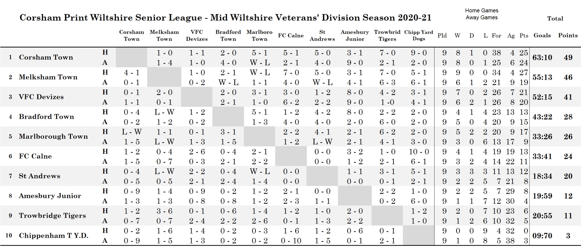 Two of the top three in the Mid Wiltshire Veterans’ Division were in action last might as Melksham Town hosted FC Calne at the InfiLED and Corsham Town hosted Trowbridge Tigers in a game switched to the Southbank Ground.