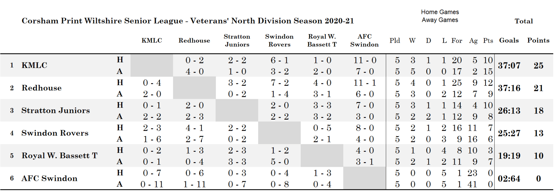 Both KMLC and Redhouse have Swindon Rovers still to play and Redhouse then have one further game against an AFC Swindon side still looking for their first points of the season. Redhouse play both their two games before KMLC see action again and even if they win both it will not be enough to pip KMLC if KMLC then defeat Swindon Rovers in the final fixture of the season in the North Division.