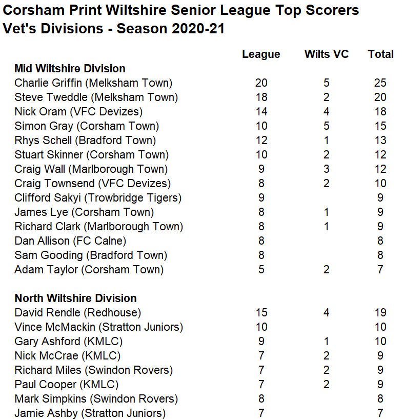 The golden boot award for the leading striker in the Veteran’s Divisions went to Charlie Griffin of Melksham Town who scored 25 goals in all competitions, five more than his fellow striker Steve Tweddle. David Rendle led the way in the North Division with 19, one less than Tweddle.