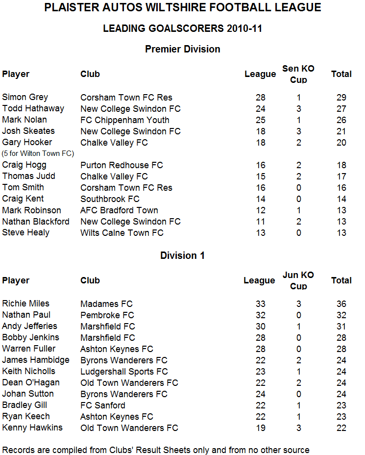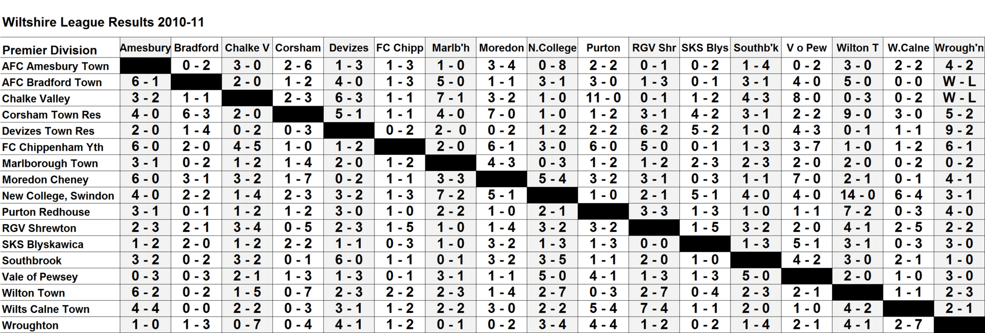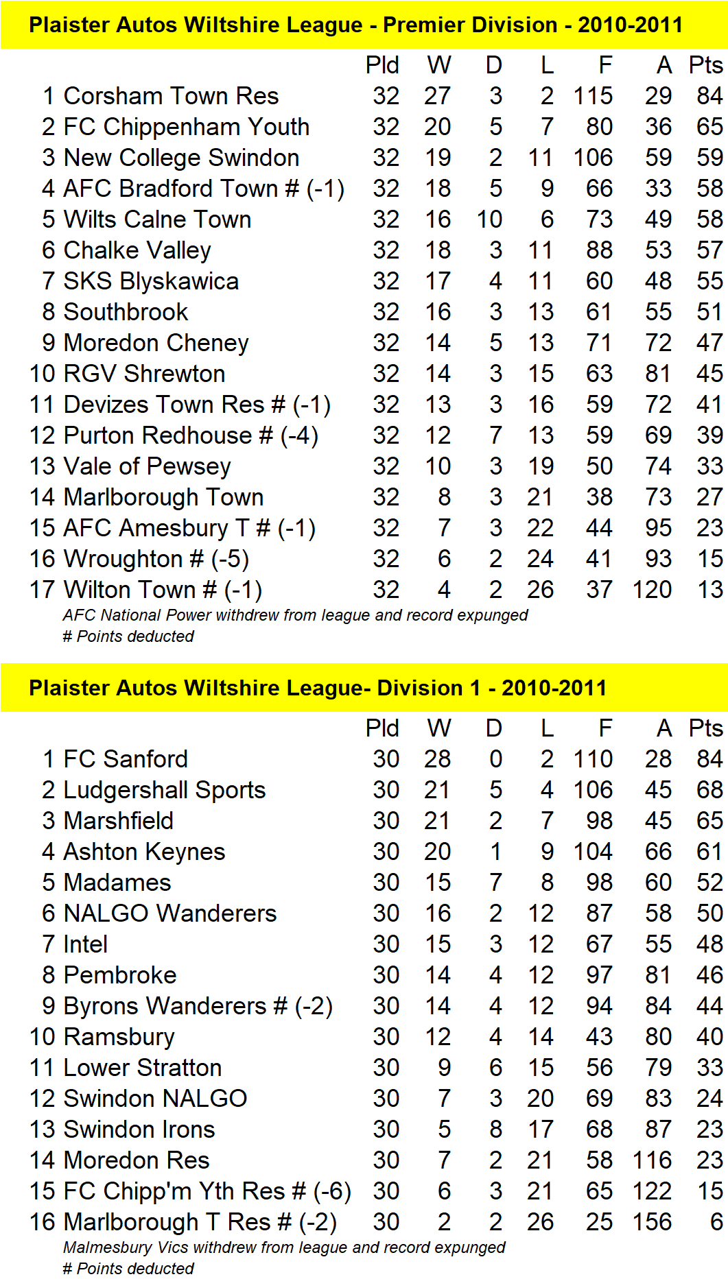 The Premier Division title was won by Corsham Town Reserves, who led most of the season and finished 19 points clear. FC Chippenham Youth won their games in hand to pip defending champions, New College Swindon to the runners-up position. Whilst New College were unable to make it three straight titles, their third-place finish was enough to enable them to be promoted to the Hellenic League. FC Chippenham Youth won the Corsham Print Senior KO Cup, defeating New College Swindon in the final. A late New College equaliser took the tie into extra time, and then a late Chippenham equaliser took the tie to a penalty shoot-out, which Chippenham won 4-3.