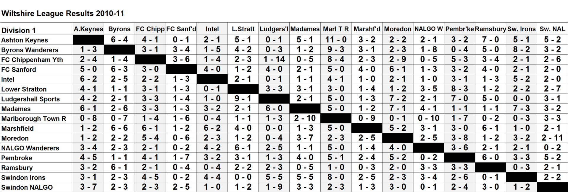 The Division 1 title was won in similar fashion by FC Sanford, who also led most of the season and finished 16 points clear. Due to the late withdrawal of a club, Ludgershall Sports, who had been in second place for most of the season, had to win two of their last three games to pip Marshfield. A 5-2 away win at Nalgo Wanderers was followed by a 9-1 thrashing of Swindon Nalgo to secure that runners-up spot and meant their final game of the season against the champions would have no bearing on the final honours. Intel upset the odds and won their first honours in this league with a deserved 3-0 victory over Ludgershall Sports in the final of the Fountain Trophies Junior KO Cup.