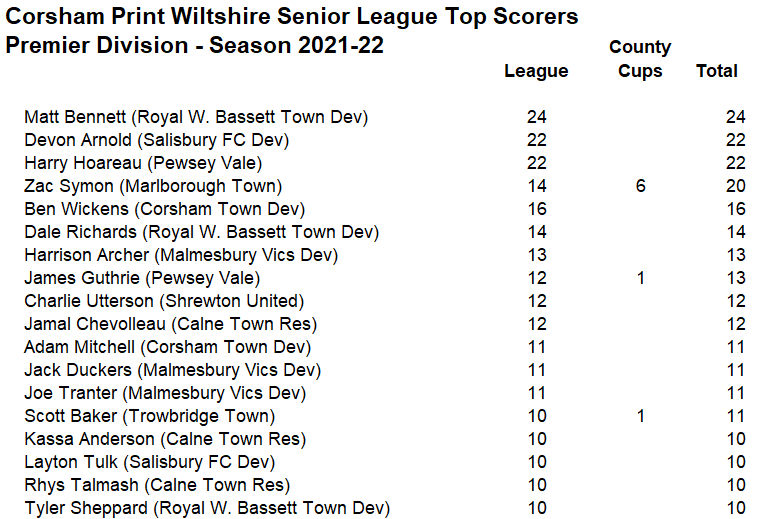 This weekend’s action in the Premier Division of the Corsham Print Wiltshire Senior League got underway on Friday night at the Flying Monk Ground in Malmesbury where Malmesbury’s Development side were involved in a goal fest against Melksham Town Reserves. Melksham started well and went in front on 15 minutes through Lenny Gale. Four minutes later Tom Arliss extended the visitors lead and it looked like Melksham might run away with things. Malmesbury had other ideas though, as James Archer pulled one back on 25 minutes after being set up by Joe Tranter. Five minutes before the break Malmesbury were back on level terms as Tranter went from provider to scorer, firing home after a goalmouth scramble. It got even better for home side Malmesbury on the stroke of half time, Callum Hall notching his second of the season after an error from the visitor’s keeper to make it 3-2 to Malmesbury. Whilst Malmesbury went into the break with the momentum going their way it was a different story after the restart. Tom Arliss, with his second of the game on 51 minutes brought Melksham back level and Melksham went back in front on the hour mark, Lenny Gale also getting his second of the game. It remained just the one goal in it until stoppage time at the end of the game when late goals from Joe English and Sam Dowell gave the score a somewhat flattering look as Melksham ran out 6-3 winners. Both teams remained where they were at the start of the night, but Melksham moved to within two points of Malmesbury who remained in 7th place.
