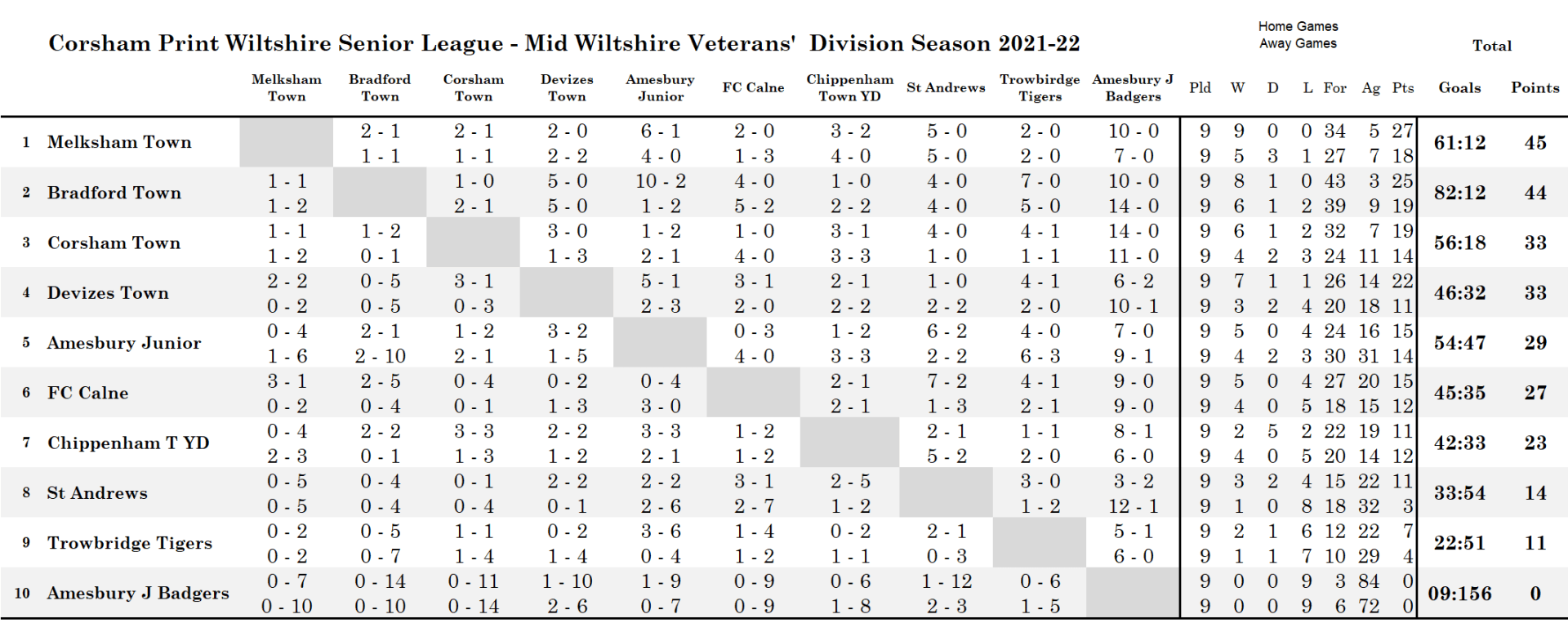 Corsham Town finished in third place, just pipping Devizes Town on goal difference. Amesbury Junior finished fifth, one place and two points ahead of FC Calne who had a tremendous end to the season winning six of their last seven league games, including that win over Melksham Town.