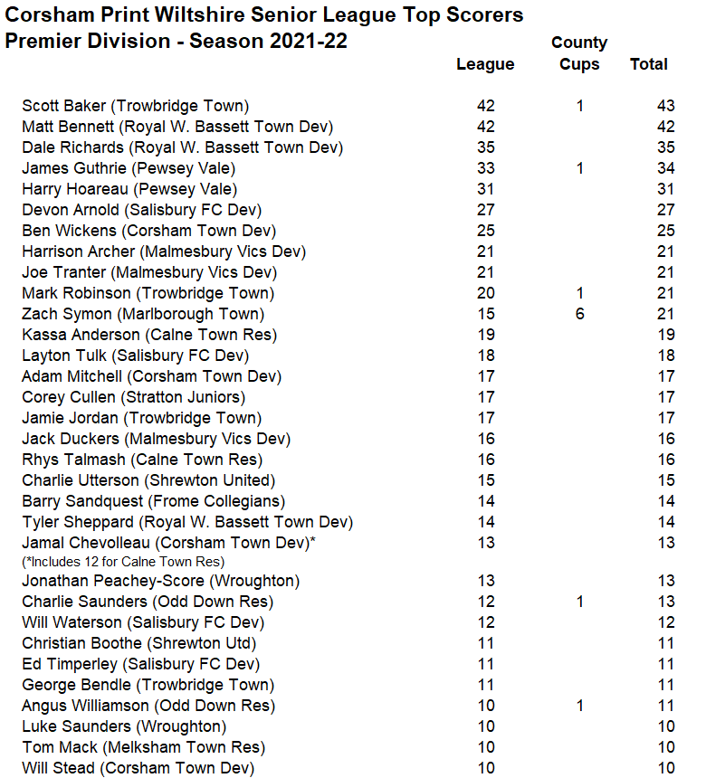 Pewsey went into their final game against their main title rivals one point clear at the top with both teams knowing that a win would give them the title. A draw would mean Royal Wootton Bassett Town, who had a superior goal difference, would then need to avoid defeat in their final game of the season away at Salisbury FC Development to take the title. In a tense affair played in front of a crowd of over 300, a solitary early goal from Royal Wootton Bassett Town Development’s Dale Richards secured the title for the visitors negating the need for them to get a result in that final game at Salisbury. They did ultimately secure a draw in that final game to finish three points clear at the top of the table in what had been a fantastic title battle between the two sides. Matt Bennett finished as joint top scorer in the division with Trowbridge Town’s Scott Baker both smashing 42 league goals and Bennett’s teammate Dale Richards was not far behind on 35 goals.