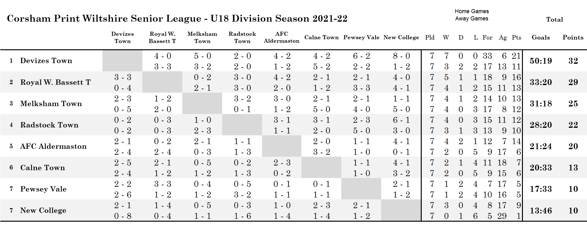 An emphatic win against New College on a night when their two nearest rivals were losing meant Devizes now had destiny in their own hands. With two games to go against Radstock and Pewsey Vale, Devizes knew they only needed to win one of those two games and they were guaranteed the title. Lose both and they would open the door for Royal Wootton Bassett Town were they to win their own game against Pewsey. If Devizes lost one and drew one and Royal Wootton Bassett Town won their final game, then a play-off would be needed to decide the title as FA rules do not allow goal difference to decide Under 18 divisions. There was also still an outside chance that Melksham Town could also be involved in a title play-off, but it would need both Devizes Town and Royal Wootton Bassett Town to lose their remaining games and Melksham to win their final game. Under that scenario a play-off would then have been required between Devizes Town and Melksham Town.