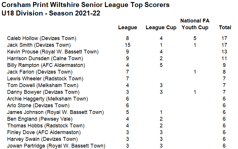 Close games were a key feature of league games this season in the Under 18 Division of the Corsham Print Wiltshire Senior League with exactly half of the 56 league games played either being drawn (7 games) or settled by a single goal margin (21) with everyone capable of beating each other on the night. In the end the title race turned into a three-team battle between Devizes Town, Royal Wootton Bassett Town and Melksham Town.