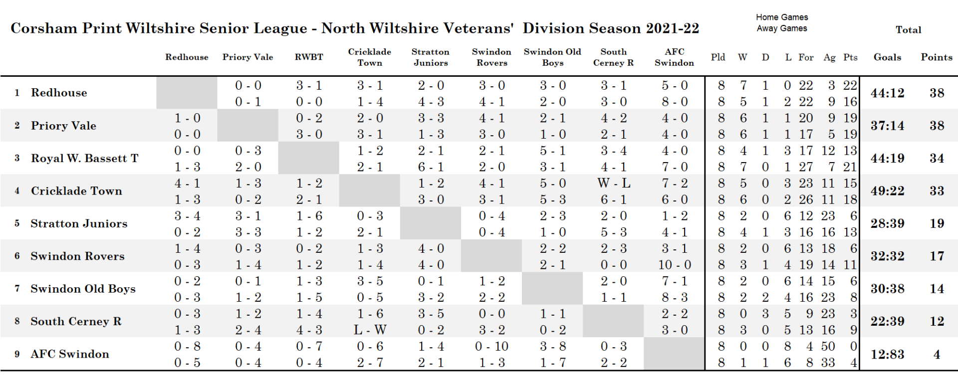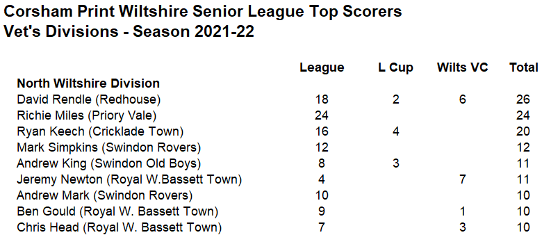 The title race in the North Division was equally exciting with three teams Priory Vale, Redhouse and Royal Wootton Bassett Town battling out right to the end, with the title finally being decided in the last game of the season between Redhouse and Priory Vale. Priory Vale and Royal Wootton Bassett Town had been the league leaders for much of the season with Redhouse being behind the other two title challengers with their fixtures.