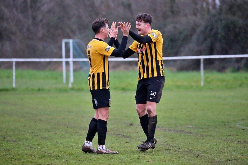 Devizes Town Res celebrate their first goal in the 3-1 win over Malmesbury and Cullen Wylie puts away the 3rd goal to secure the points