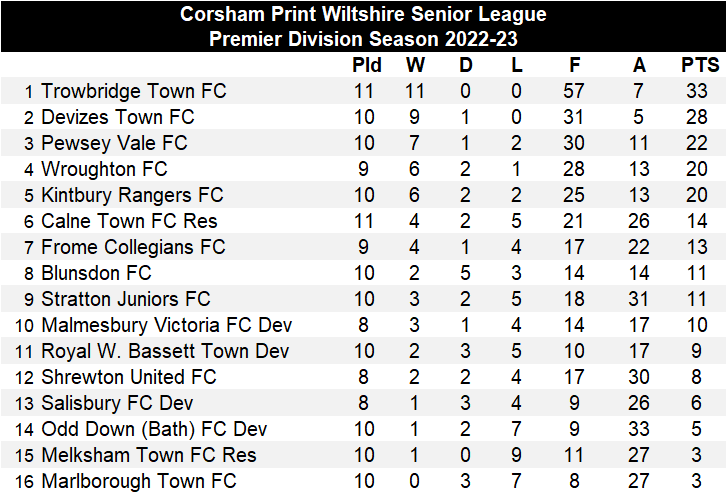 who started the day in fourth place. Goals from Bradley Passey and Jamie Wallin gave Kintbury a 2-0 half time lead, but it was a different story after the break as Devizes got themselves back into the game and then went on score a winner to run out 3-2 winners. Two goals for Jack Coward and one from new signing Rhys Talmash ensured Devizes maintained their unbeaten record and meant they did not lose further ground to the league leaders, remaining five points behind Trowbridge but with a game in hand. Kintbury dropped one place in the table to fifth as a result of the defeat.