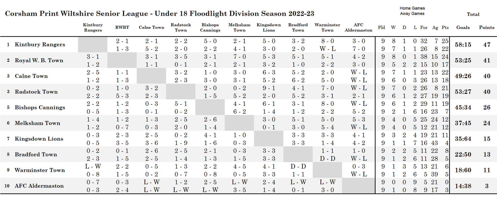 Congratulations to Kintbury on their title success in their first season at the Under 18 level, losing just that one game all season. Congratulations also to Royal Wootton Bassett Town on securing runners-up for the second consecutive season and well done also to Calne Town and Radstock Town for their excellent seasons, with just a single point in the end separating the runners-up from the two sides who finished in joint third position. Calne Town and Radstock Town also had the consolation of that cup final appearance with Calne winning the final 3-0 to lift the trophy. They had been beaten finalists in the inaugural Under 18 Cup competition, but this time were convincing winners on the night.
