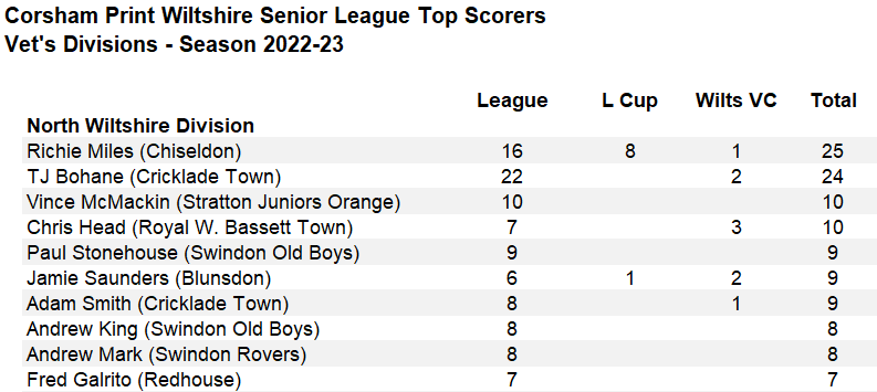 There were also three games in the North Wiltshire Division this week starting on Tuesday night when once again there were plenty of goals with both Swindon Rovers and division leaders Cricklade Town both scoring seven. At the Corinium Stadium Cricklade Town