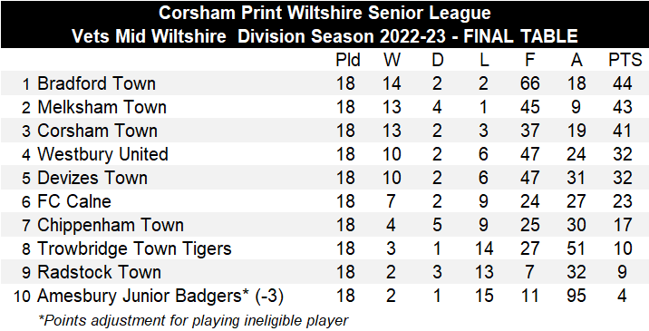The final honours across the five divisions of the Corsham Print Wiltshire Senior League were decided this week with the Mid Wiltshire Veterans’ Division champions and runners-up finalised. Getting the teams at the top of the Mid Wiltshire Vets' Division to play each other this season has been like herding cats at times, but the last two games were finally completed this week. A 0-0 draw on Monday night at Green Lane between Bradford Town