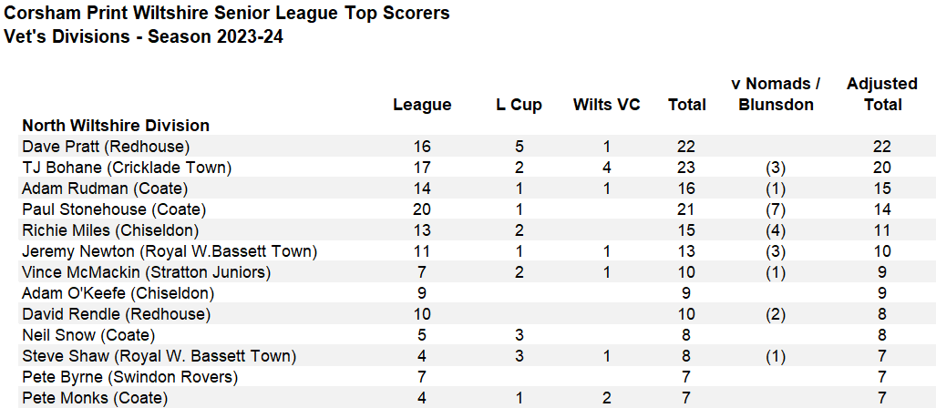 As noted above the North Wiltshire Division started with 12 teams but just nine would go the full duration with both Nomads, Blunsdon and Swindon Old Boys withdrawing due to issues with being able to raise a side. Nomads suffered some heavy defeats early on in the season and with players not paying subs were forced to withdraw after just playing four games and having one game awarded to opponents. Blunsdon’s participation was in doubt right at the start of the season, but they were given a second chance by the club’s own committee and commenced the season and would still be playing games early in the New Year. However, following a 7-0 defeat at the hands of Cricklade, with only ten players, the club’s committee called time on the side and their league record was expunged after 11 league games and two cup matches. Their record was expunged with them not having reached the 75% threshold. Swindon Old Boys withdrew from the league at the end of March after failing to raise a side for their game against Coate. Their remaining four games were awarded to their scheduled opponents.