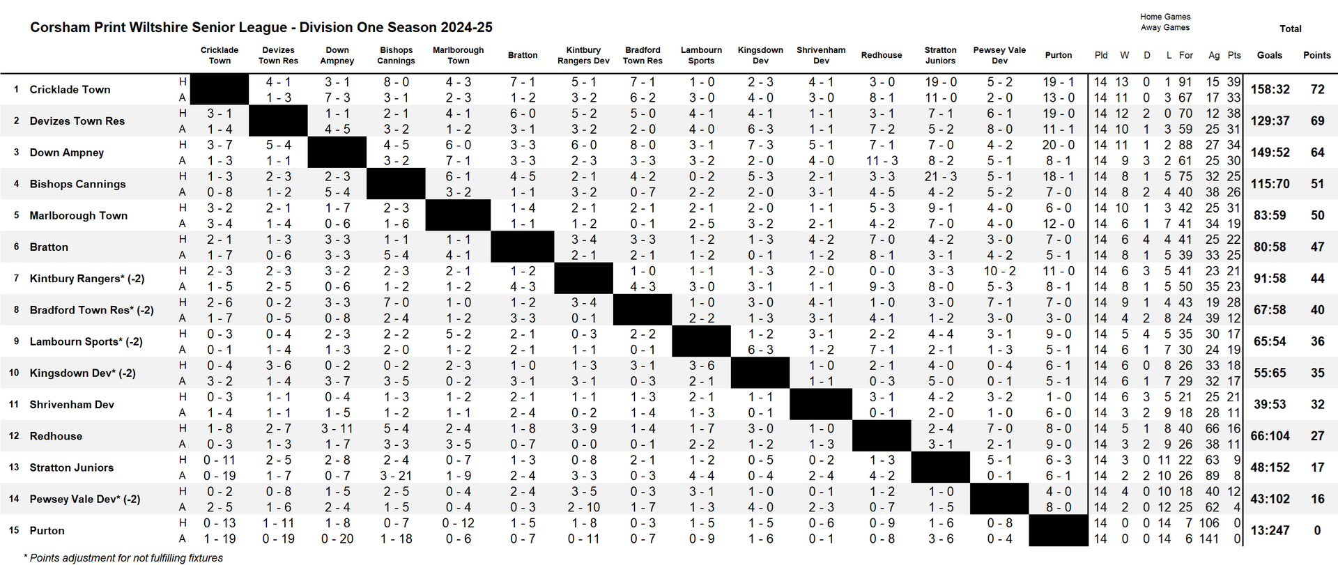 Division One once again started the season with 15 teams, one short of capacity following the late withdrawal of Ludgershall Sports. Ahead of the season new Cricklade Town manager Mani Roper had assembled a side containing players who in recent seasons had been playing at Steps 5 and 6 in the Hellenic League and they were quickly installed as favourites by many to secure a return to the Premier Division. They started the league season with nine straight wins in August and September to sit three points clear at the top of the table at the end of September with two games in hand over second placed Bishops Cannings, with Down Ampney five points behind in third place. Those nine games had seen Cricklade score 58 goals, an average of over six per game, helped by a massive 19-1 win over a struggling Purton side and that run also saw them defeat Devizes Town Reserves 4-1, a result that would turn out to be very important come the end of the season.