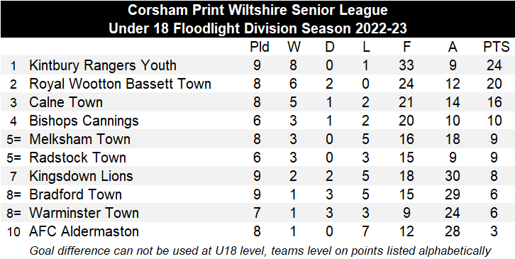 There was further cup action involving one of the Under 18 sides on Sunday when Bishops Cannings met Malmesbury Victoria Youth from the North Wilts & District League in the quarter finals of the Wiltshire Youth Cup. The two sides could not be separated at the end of 90 minutes, sharing six goals as it ended 3-3 with penalty kicks required to settle matters. Despite Bishops Cannings having a chance to win the penalty shootout, a vital kick was missed and Malmesbury Vics prevailed in the shootout, winning 4-3 meaning the last side from the Under 18 Floodlit Division exited the prestigious County Cup competition. On target for Bishops Cannings in open play were Caleb Hollow with two and one for the Division’s leading scorer Jack Smith, his 11th of the season. Joining Malmesbury in the semi-finals will be FC Calne Youth and AFC Corsham Warriers with the final team set to be the winner of the Devizes Town versus Kingsdown Lions tie which is set to be played next Sunday.