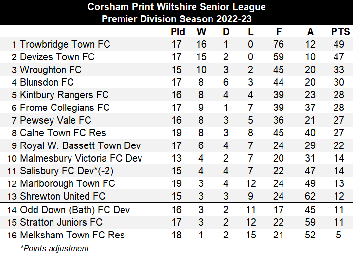 The games between Melksham Town Reserves and Stratton Juniors, Malmesbury Vics Development’s trip to Pewsey Vale and the scheduled top end of the table clash between Wroughton and Devizes Town were all postponed due to waterlogged pitches.