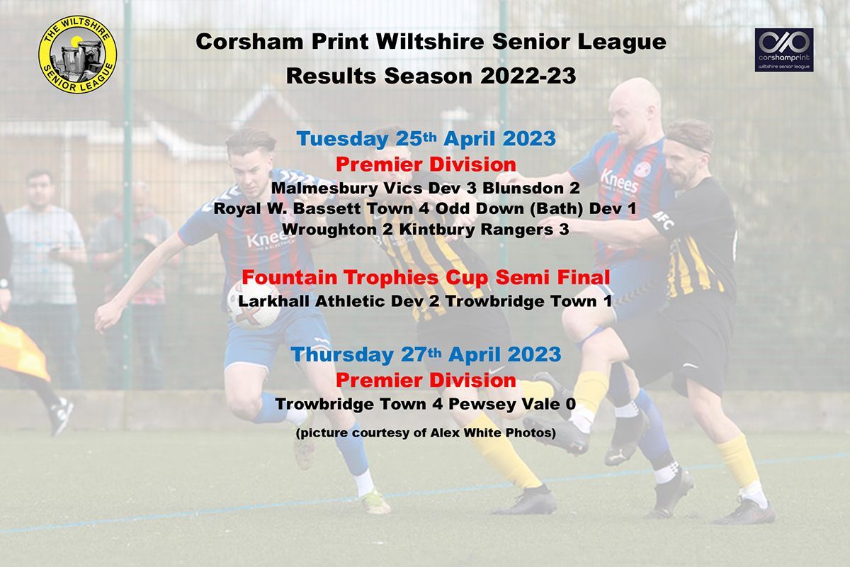 Tuesday night saw the second semi final in the Fountain Trophies Cup with Division One champions Larkhall Athletic Development up against the expected champions in the Premier Division Trowbridge Town. Larkhall were expected to give the Premier Division leaders a stern test and it proved to be just that. Trowbridge gave Larkhall a guard of honour as they came onto the pitch in recognition of their title achievement, which was a nice touch ahead of such an important game. The match itself saw a tight first half, with the two sides turning round at half time with the game still looking for its first goal. The deadlock was eventually broken in the second half when Theirry Swaby continued his rich vein of form in front of goal when he put Larkhall ahead with his 14th of the season, this was his third in the Fountain Trophies Cup this season. Both sides were then reduced to ten men when Larkhall’s Harley Prior and Trowbridge’s Connor McKay both saw red. Just as it looked like it would be Larkhall who progressed to the final in normal time, a late equaliser from Tom Mack levelled matters up meaning extra-time was needed to settle matters. The winning goal in extra time was to come four minutes from the end of the additional half-an-hour, and it went the way of home side Larkhall, Harvey Kendrick with the winning strike to send his Larkhall side through to the cup final. The final is scheduled to take place at Corsham Town on Saturday 13th May where Larkhall's opponents will be Devizes Town.
