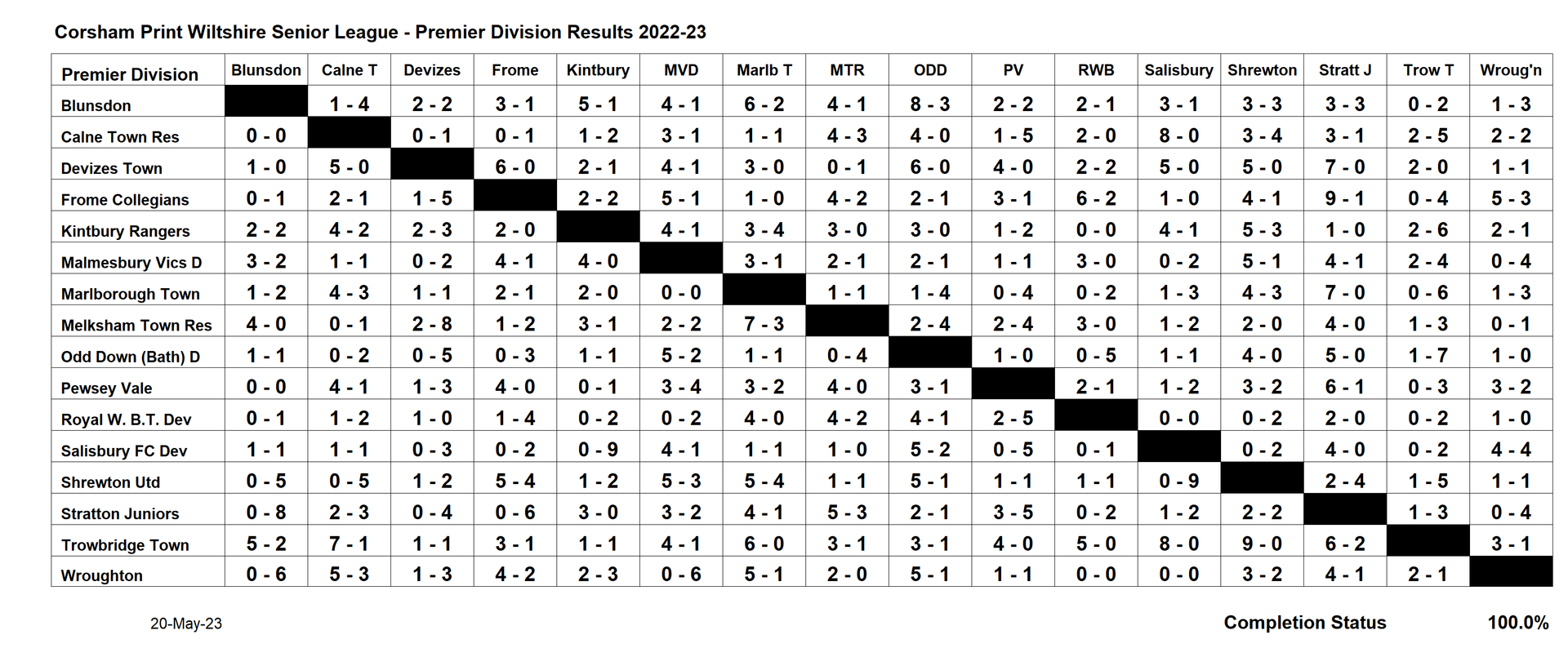 The curtain was finally drawn on the Premier Division of the Corsham Print Wiltshire Senior League this afternoon with the final game taking place at Odd Down where Odd Down (Bath) Development’s visitors were Wroughton. Wroughton had been unable to field a side last week but with so much at stake it was imperative that the game was played and thankfully that happened this weekend. Odd Down (Development) went into the game knowing that nothing less than a win was needed to ensure they remain in the Premier Division for another season. They got over the line in the end by the narrowest of margins, a penalty in the sixth minute from Cameron New being enough to retain their Premier Division status for another season as they ran out 1-0 winners in what has been a difficult season for the club following the death of manager Mark Brown. Wroughton knocked on the door in the second half, creating a number of good chances, but couldn’t find that elusive equaliser which would have saved Marlborough Town from relegation. With Larkhall Athletic Development promoted from Division One as champions they can look forward to local derbies with their near neighbour next season.