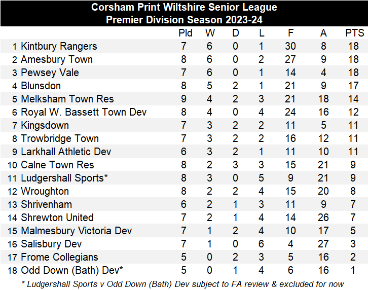 Joining both Kintbury Rangers and Amesbury Town on 18 points are Pewsey Vale who picked up their sixth win of the season with a 1-0 victory over Kingsdown. For KIngsdown this was their second 1-0 defeat of the week after starting the week as one of the sides still unbeaten after the opening month of the campaign. Pewsey's solitary goal was scored by leading scorer James Guthrie on his return from suspension. Guthrie could easily have had a hat-trick in the first half, missing a penalty and also failing to convert a one-on-one with Kingsdown keeper Dan Lawrence. Pewsey continued to dominate after the break but were denied on a number of occasions by Lawrence and they also spurned several good chances. The closest they went to adding to their lead was when Matt James hit the crossbar from 20 yards out. At the other end Kingsdown created little to trouble stand-in keeper Ben King who was deputising for Louie Latouche and who kept a clean sheet on his first team debut. That is now five clean sheets in seven games for Craig Kent’s side so far this season and they are once again serious contenders for the title this season.