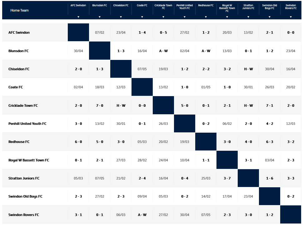 In the North Wiltshire Division, Cricklade Town picked up another three points in their quest to defend the title they won last season with a 5-0 win over AFC Swindon to move to within four points of leaders Redhouse with a game in hand. There were two more goals for TJ Bohane, who took his total for the season to 15 in the process, with the other goals coming through Phil Corcoran, Adam Smith and Dean Wilson.