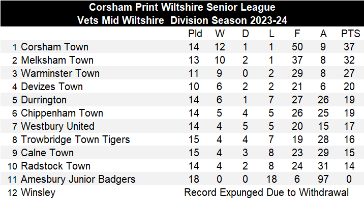 League leaders Corsham Town then made no mistake the following night, inflicting a heavy 8-1 defeat on bottom of the table Amesbury Junior Badgers to open up a five-point lead over Melksham at the top of the table. Simon Gray led the way for Corsham hitting five of the eight goals, with the other three coming through Ross Hall, Ross Lye and Jamie Lyons. Although Melksham have a game in hand over Corsham it is now very much advantage Corsham who have six games to play. They have a much easier run in than their two nearest challengers Melksham and Warminster Town, who still have to play each other twice.